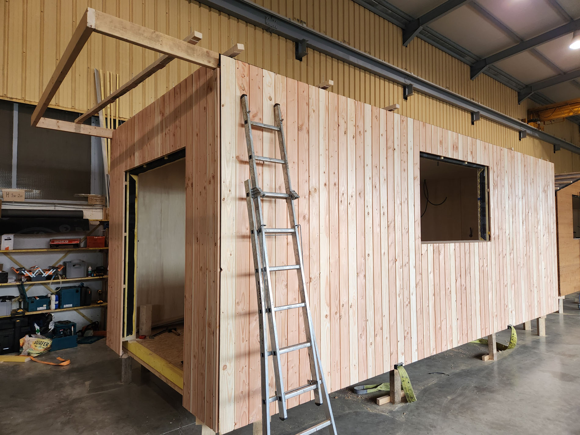 Fabrication sur mesure d'une tiny-studio de jardin de 20m² placé en extension d’une maison existante. Nous avons construit ce studio de jardin sur le même principe qu’une extension ossature bois classique mais avec la particularité de pouvoir être déplacé en camion grue. Nous l’avons donc livrée et posée chez Aurélie sur des fondations légères afin de lui permettre de s’installer au plus vite pour de lancer son activité de boulangerie artisanale.