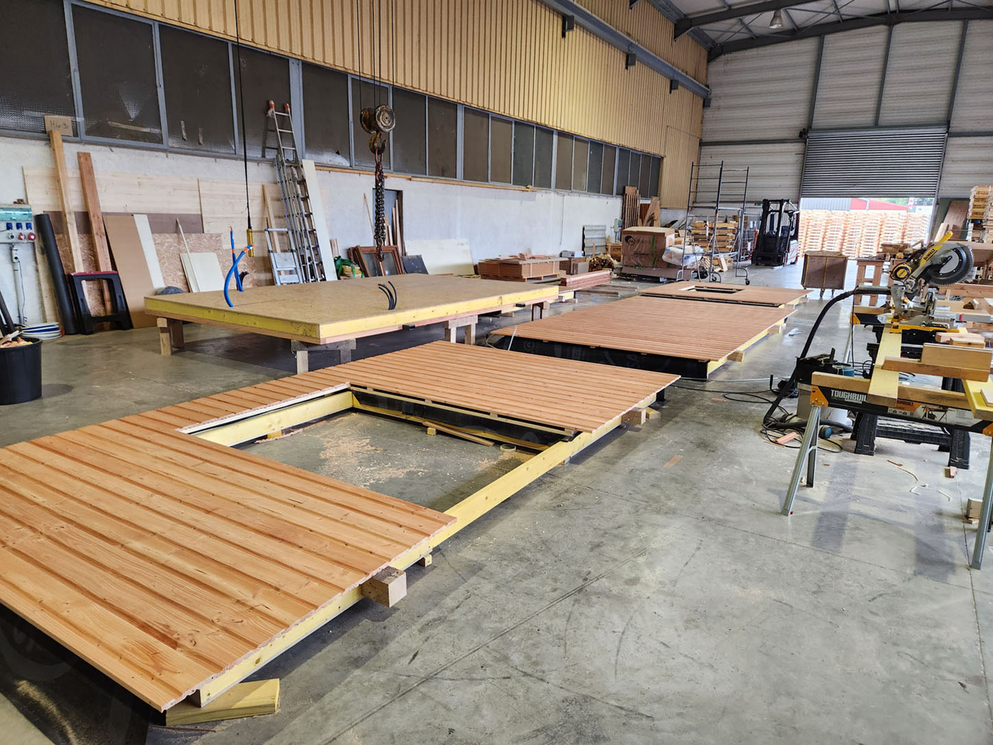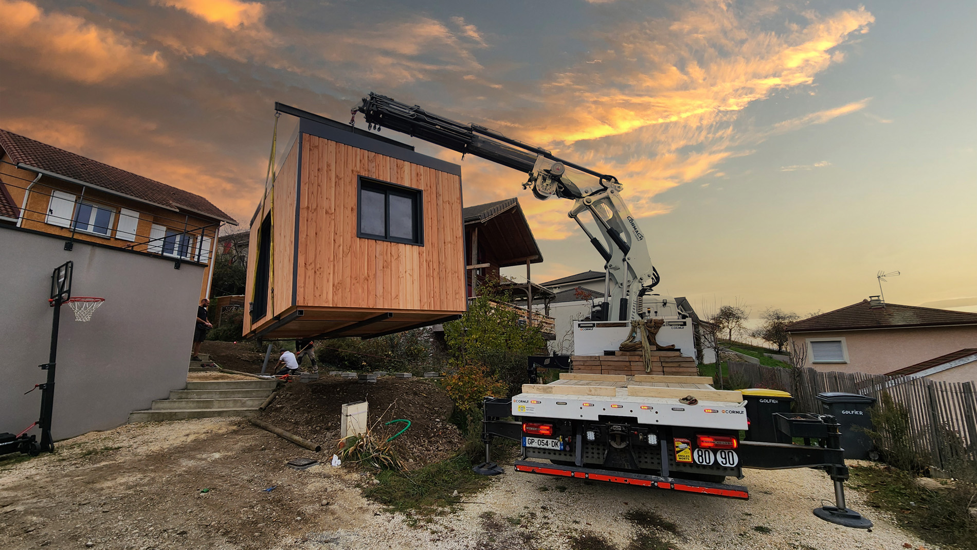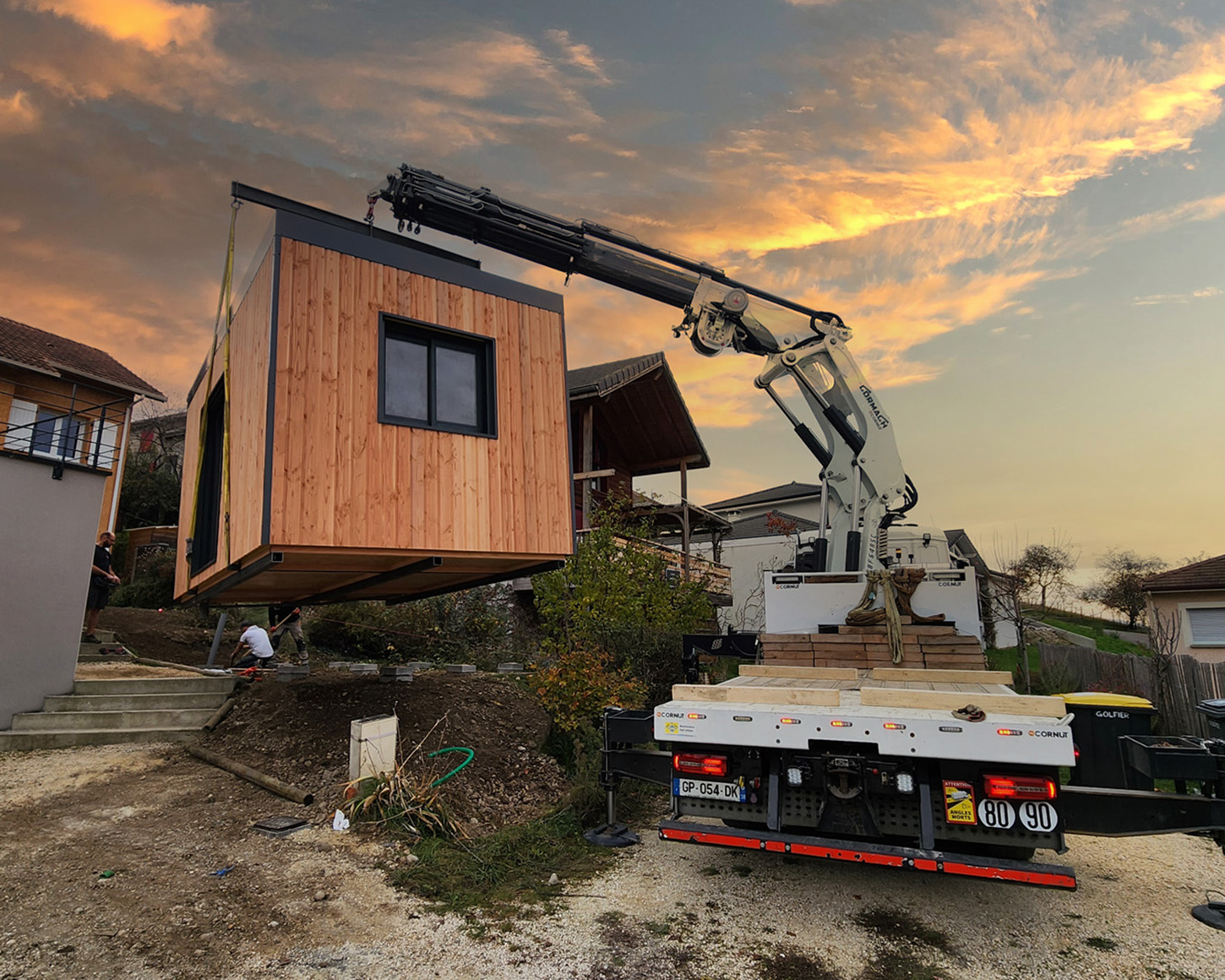 Nous avons dans un premier temps affiné le projet afin de l’adapter à un budget modeste. L’idée était d’avoir un studio fonctionnel tout en gardant la qualité habituelle dans le choix des matériaux et dans la durabilité de la construction tout en épurant au maximum la construction. Nous avons donc construit un module de 3*5 m avec toiture plate équipé de 3 menuiseries aluminium avec volet roulants motorisés. L’aménagement intérieur à été porté principalement sur la création d’une salle de bain attenante à l’espace salon / chambre équipée d’une douche d’un lave main et d’un wc standard à eau. Nous avons livré le projet chez le client à l’aide d’un camion grue qui nous a permis de déposer le studio de jardin sur les fondations légères en plot béton préalablement réalisés avec précision et efficacité. Le jour de la livraison une équipe d’artisan était également sur place pour raccorder les réseaux d’eau, électricité et chauffage par clim réversible ce qui a permis une mise en service sans délais.